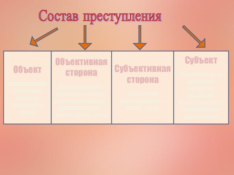 Действие или без-действие + послед- ствия преступления + причинная связь + способ, время, место