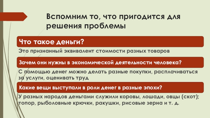 У разных народов деньгами служили коровы, лошади, овцы (скот); топор, рыболовные крючки, ракушки, рисовые зерна и т. д.