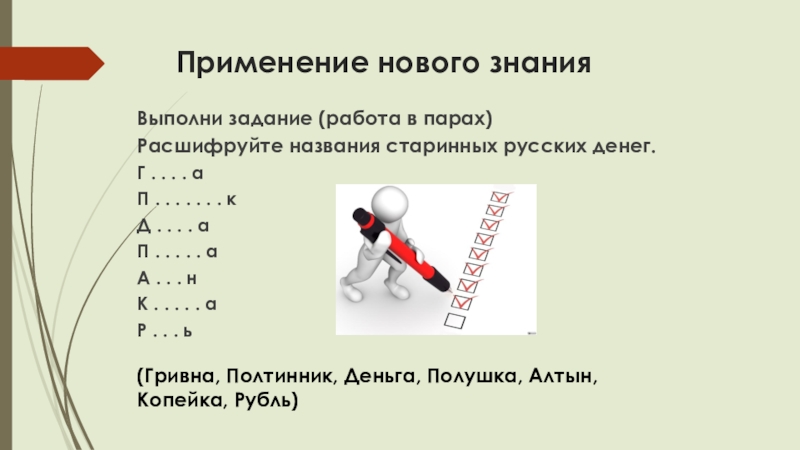 (Гривна, Полтинник, Деньга, Полушка, Алтын, Копейка, Рубль)