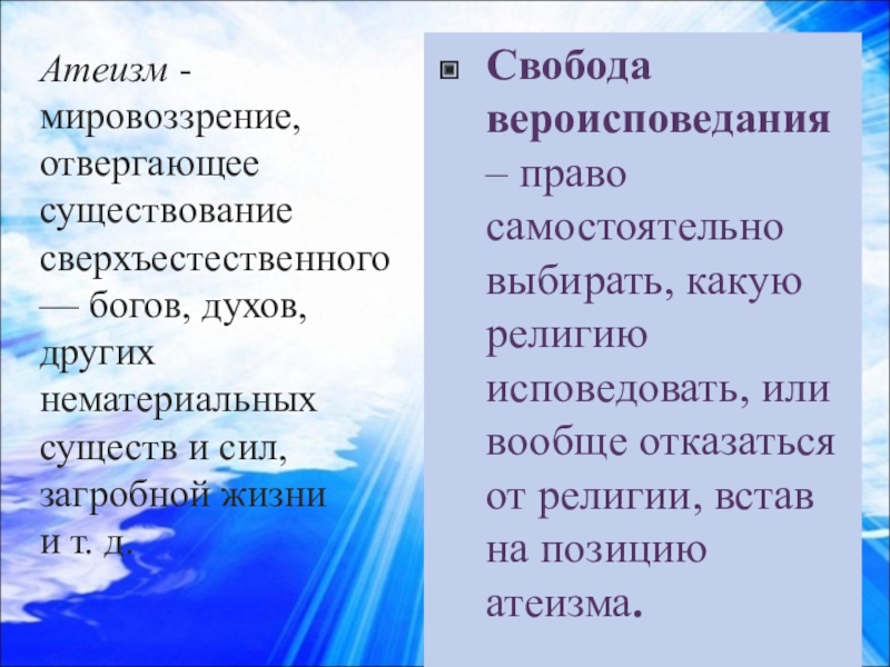 Атеизм - мировоззрение, отвергающее существование сверхъестественного — богов, духов, других нематериальных существ и сил, загробной жизни и т. д.