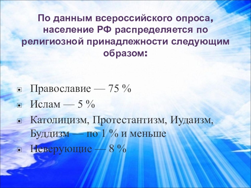 Католицизм, Протестантизм, Иудаизм, Буддизм — по 1 % и меньше