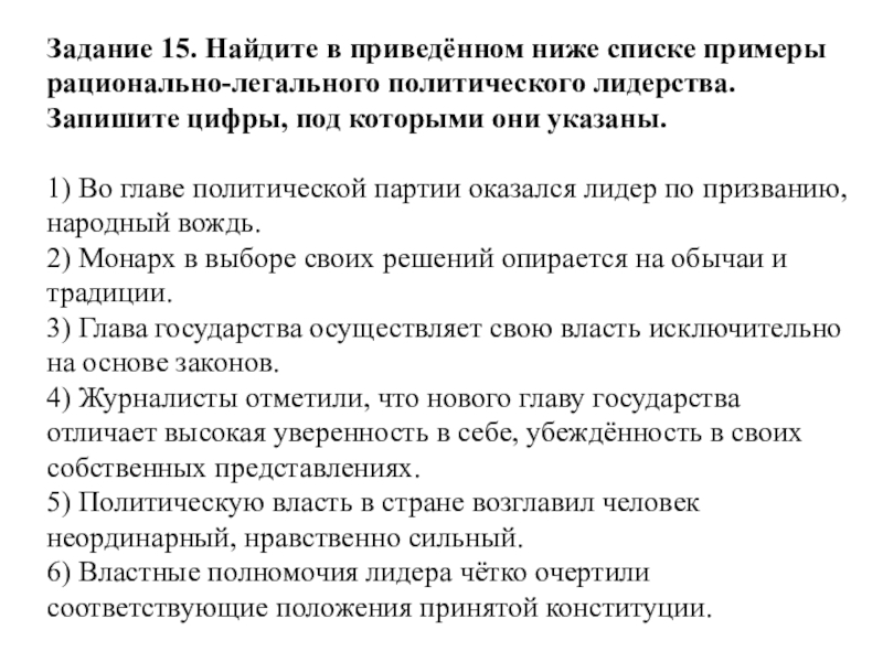 типу политического лидерства? Запишите цифры, под которыми эти черты указаны.