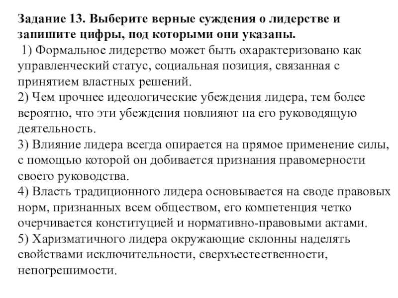 Слайд 14Задание 13. Выберите верные суждения о лидерстве и запишите цифры, под