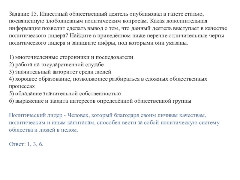 3) одно предложение, раскрывающее с опорой на знание курса любую из функций политического лидера в обществе, например: «Политический лидер вырабатывает политический курс, отражающий реалии жизни общества».