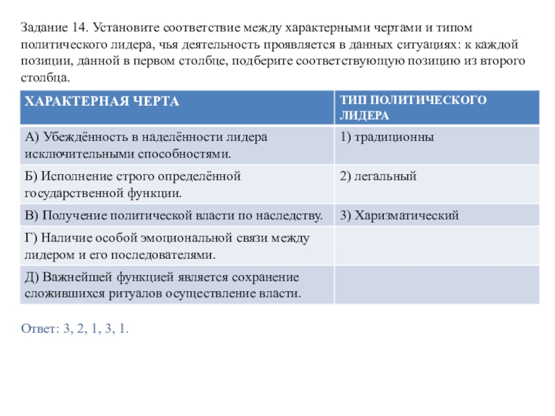 Слайд 17Задание 14. Установите соответствие между характерными чертами и типом политического лидера,