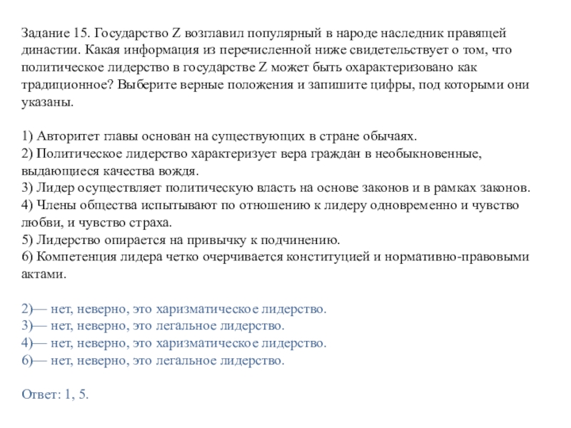 Слайд 18Задание 15. Государство Z возглавляет харизматический лидер. Какие черты свойственны данному