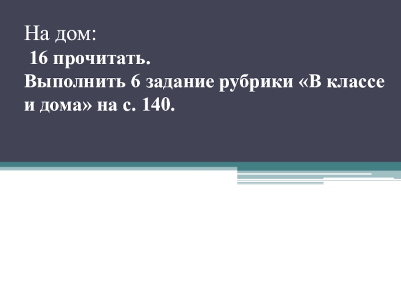 На дом:  16 прочитать. Выполнить 6 задание рубрики «В классе и дома» на с. 140.