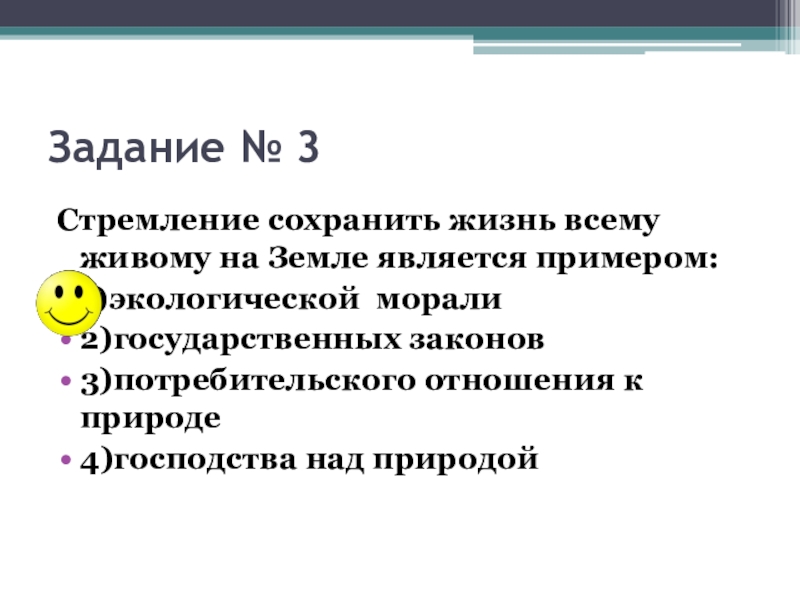 Задание № 3Стремление сохранить жизнь всему живому на Земле является примером:1)экологической морали2)государственных законов3)потребительского отношения к природе4)господства над