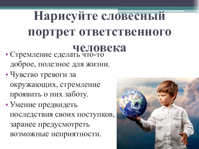 Нарисуйте словесный портрет ответственного человекаСтремление сделать что-то доброе, полезное для жизни. Чувство тревоги за окружающих, стремление проявить