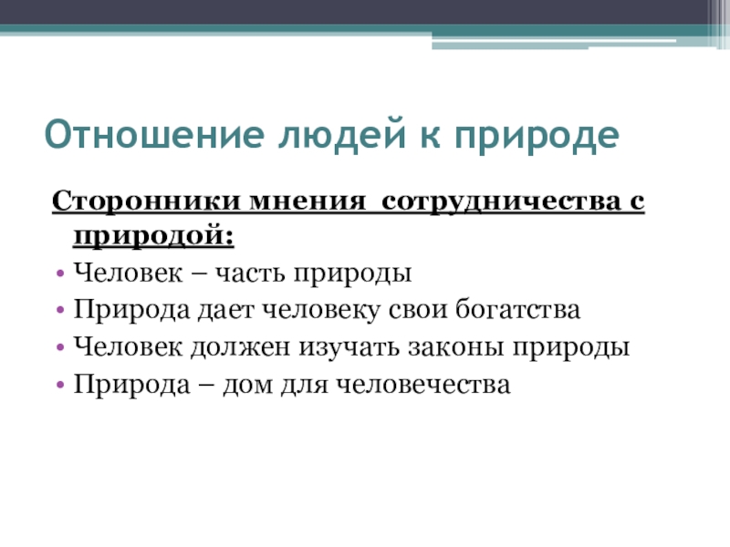 Отношение людей к природеСторонники мнения сотрудничества с природой:Человек – часть природыПрирода дает человеку свои богатстваЧеловек должен изучать
