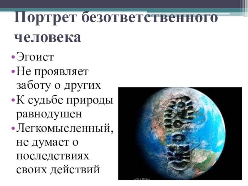 Портрет безответственного человекаЭгоистНе проявляет заботу о другихК судьбе природы равнодушенЛегкомысленный, не думает о последствиях своих действий