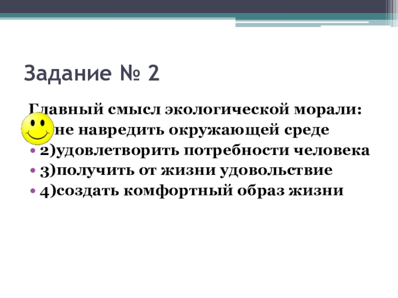 Задание № 2Главный смысл экологической морали:1)не навредить окружающей среде2)удовлетворить потребности человека3)получить от жизни удовольствие4)создать комфортный образ жизни