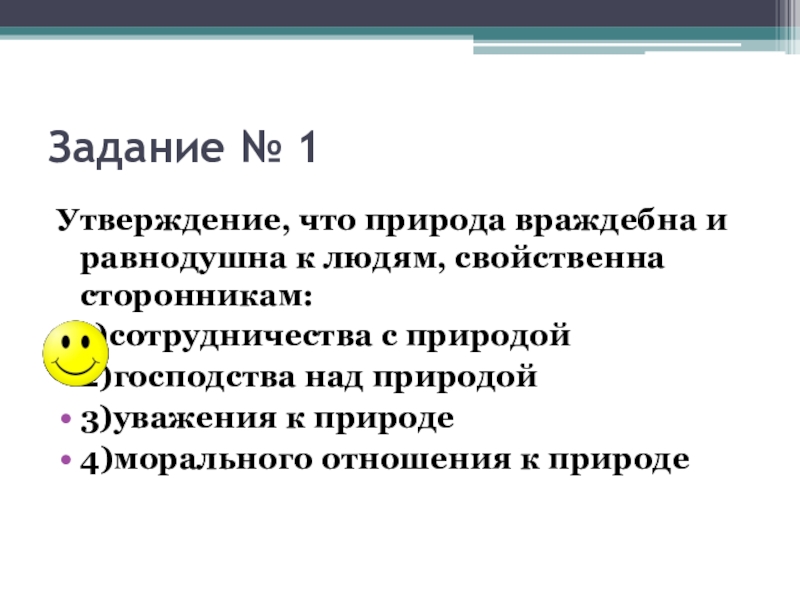 Задание № 1Утверждение, что природа враждебна и равнодушна к людям, свойственна сторонникам:1)сотрудничества с природой  2)господства над