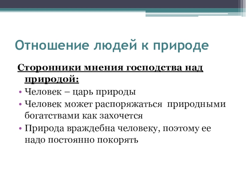 Отношение людей к природеСторонники мнения господства над природой:Человек – царь природыЧеловек может распоряжаться природными богатствами как захочетсяПрирода