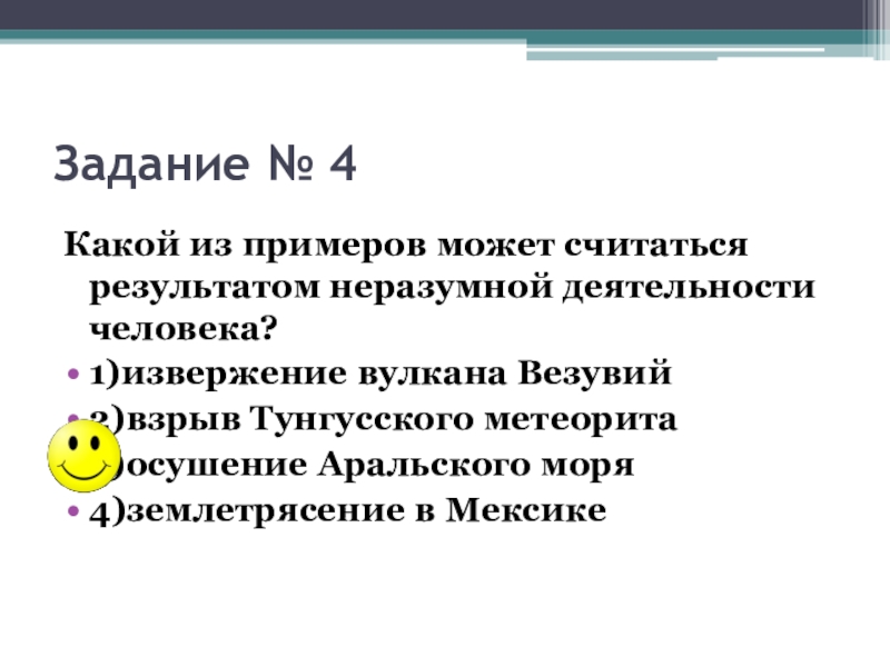 Задание № 4Какой из примеров может считаться результатом неразумной деятельности человека?1)извержение вулкана Везувий2)взрыв Тунгусского метеорита3)осушение Аральского моря4)землетрясение