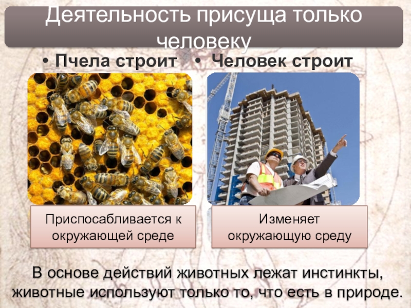 В основе действий животных лежат инстинкты, животные используют только то, что есть в природе.