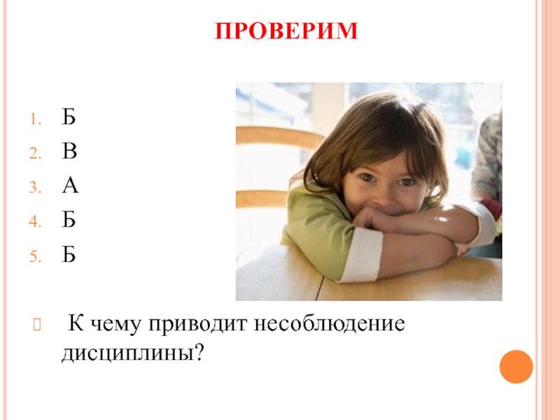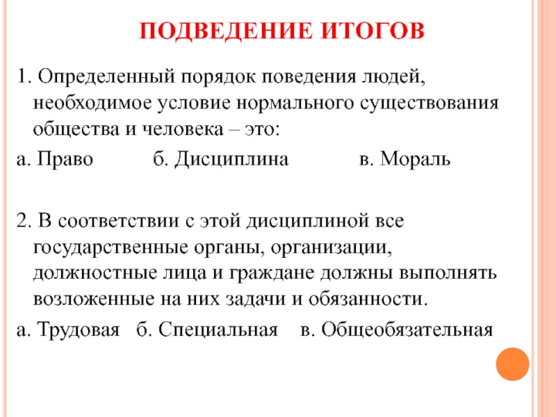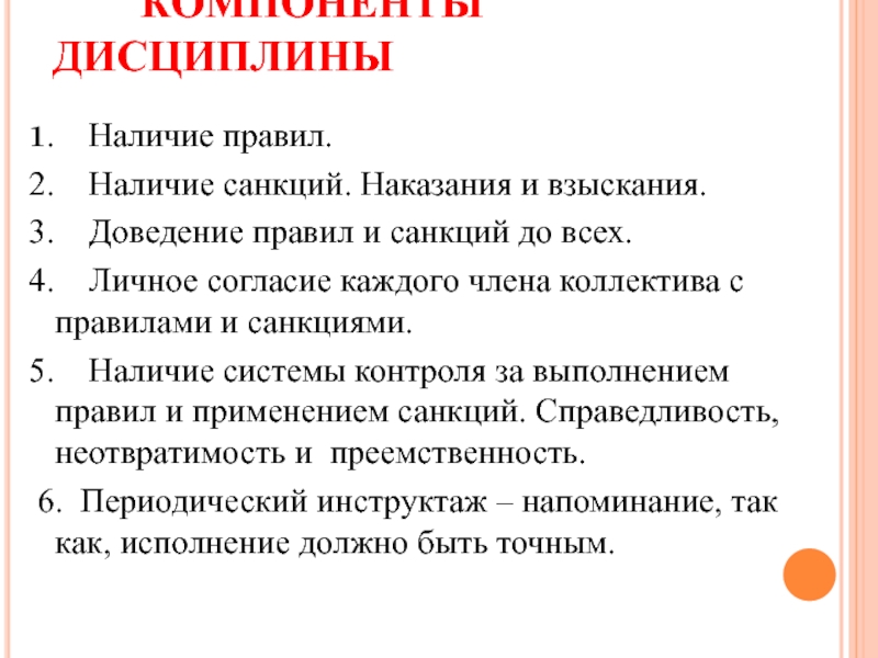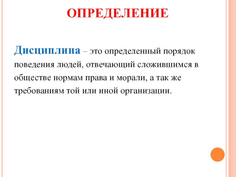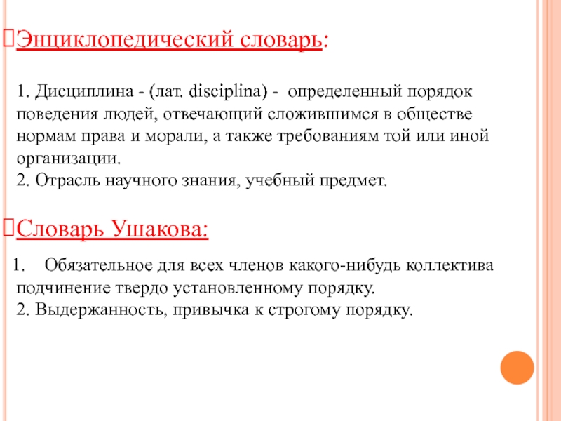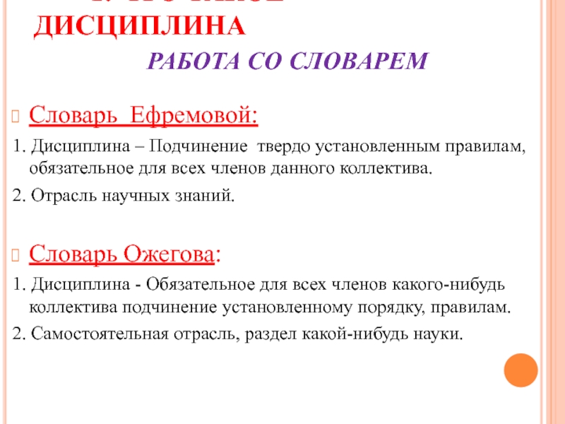 1. Дисциплина – Подчинение твердо установленным правилам, обязательное для всех членов данного коллектива.