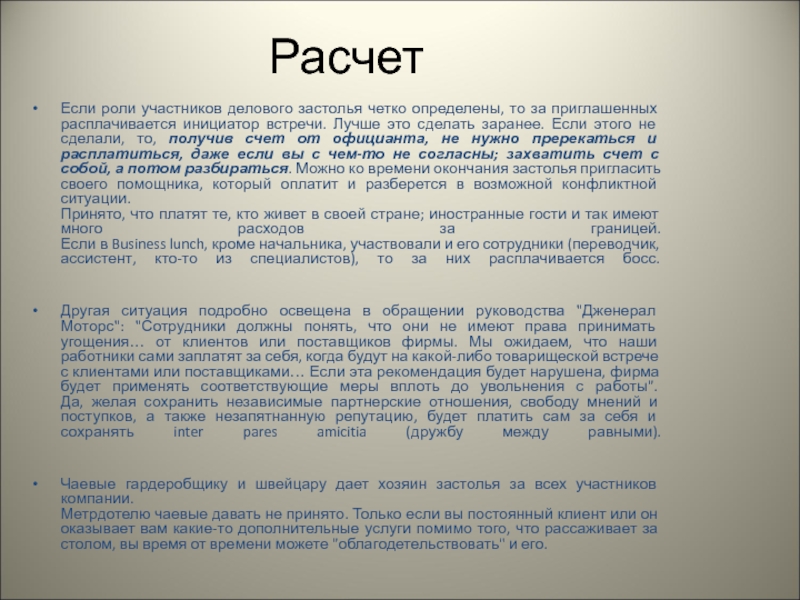 инициатор встречи. Лучше это сделать заранее. Если этого не сделали, то, получив счет от официанта, не нужно пререкаться и расплатиться, даже если вы с чем-то не согласны; захватить счет с собой, а потом разбираться. Можно ко времени окончания застолья пригласить своего помощника, который оплатит и разберется в возможной конфликтной ситуации.