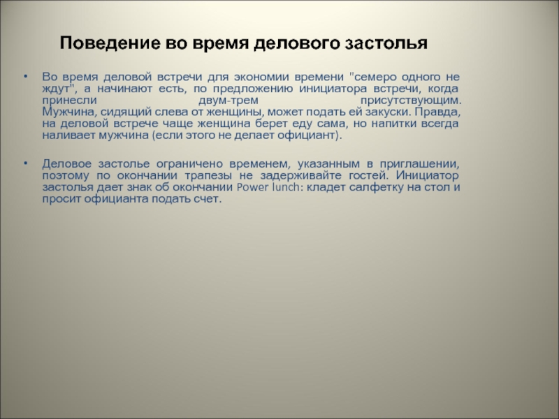 Деловое застолье ограничено временем, указанным в приглашении, поэтому по окончании трапезы не задерживайте гостей. Инициатор застолья дает знак об окончании Power lunch: кладет салфетку на стол и просит официанта подать счет.