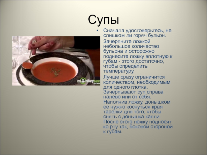 Лучше сразу ограничится количеством, необходимым для одного глотка. Зачерпывают суп справа налево или от себя. Наполнив ложку, донышком ее нужно коснуться края тарелки для того, чтобы снять с донышка капли. После этого ложку подносят ко рту так, боковой стороной к губам.