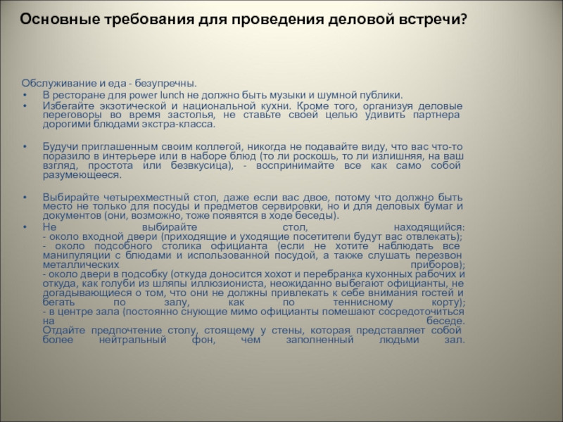 Избегайте экзотической и национальной кухни. Кроме того, организуя деловые переговоры во время застолья, не ставьте своей целью удивить партнера дорогими блюдами экстра-класса.