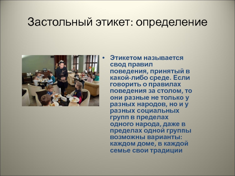 Если говорить о правилах поведения за столом, то они разные не только у разных народов, но и у разных социальных групп в пределах одного народа, даже в пределах одной группы возможны варианты: каждом доме, в каждой семье свои традиции