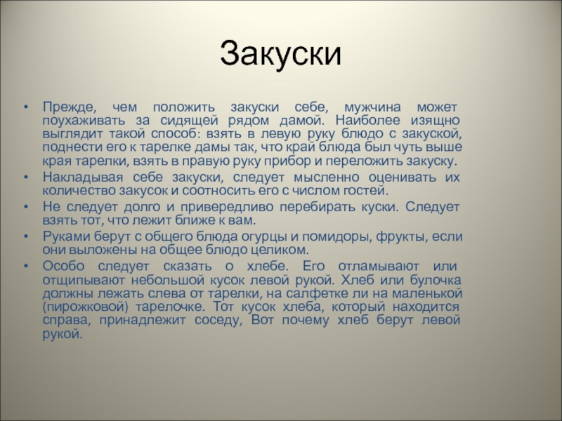 Накладывая себе закуски, следует мысленно оценивать их количество закусок и соотносить его с числом гостей.