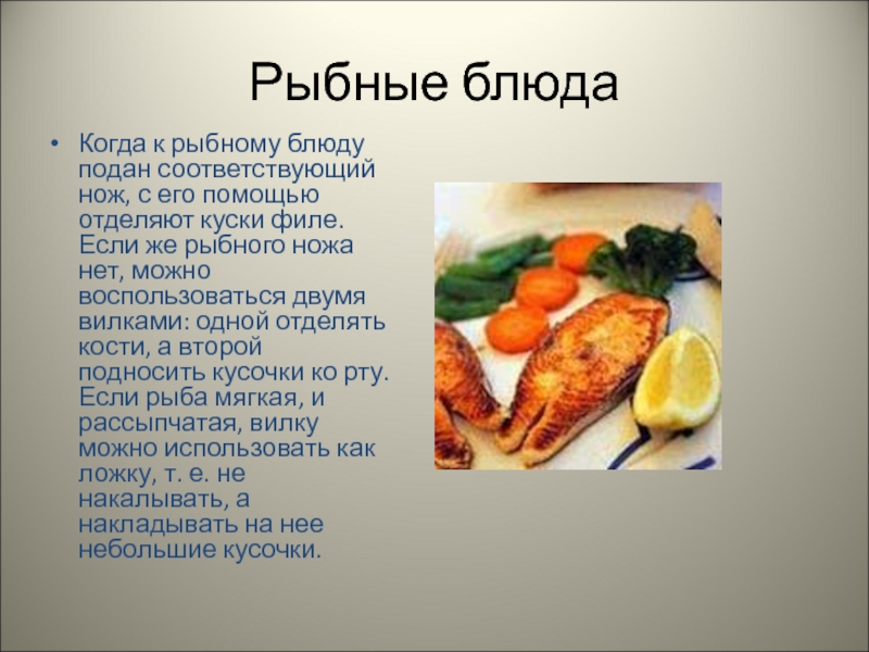 отделяют куски филе. Если же рыбного ножа нет, можно воспользоваться двумя вилками: одной отделять кости, а второй подносить кусочки ко рту. Если рыба мягкая, и рассыпчатая, вилку можно использовать как ложку, т. е. не накалывать, а накладывать на нее небольшие кусочки.
