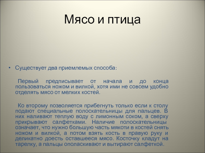 Ко второму позволяется прибегнуть только если к столу подают специальные полоскательницы для пальцев. В них наливают теплую воду с лимонным соком, а сверху прикрывают салфетками. Наличие полоскательницы означает, что нужно большую часть мякоти в костей снять ножом и вилкой, а потом взять кость в правую руку и деликатно доесть оставшееся мясо. Косточку кладут на тарелку, а пальцы ополаскивают и вытирают салфеткой.