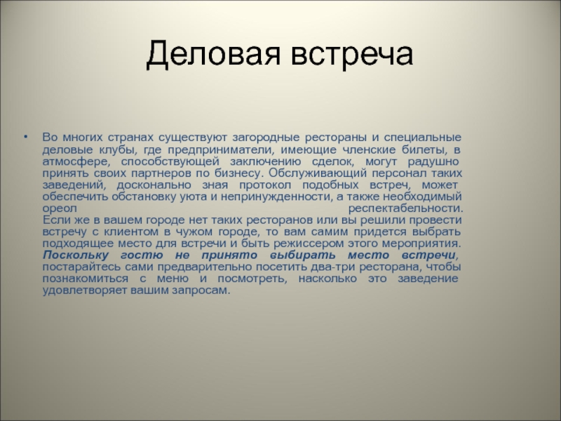 Если же в вашем городе нет таких ресторанов или вы решили провести встречу с клиентом в чужом городе, то вам самим придется выбрать подходящее место для встречи и быть режиссером этого мероприятия. Поскольку гостю не принято выбирать место встречи, постарайтесь сами предварительно посетить два-три ресторана, чтобы познакомиться с меню и посмотреть, насколько это заведение удовлетворяет вашим запросам.