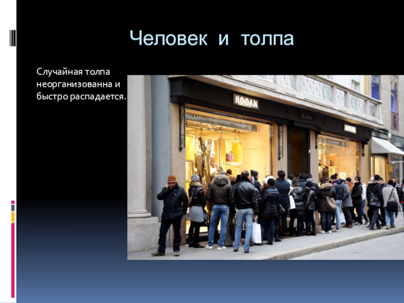 Человек и толпаСлучайная толпа неорганизованна и быстро распадается.
