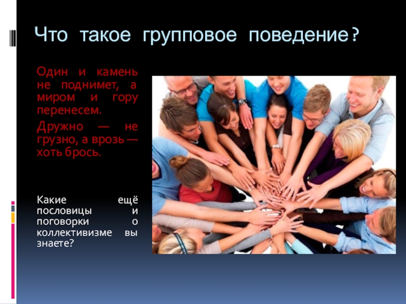 Что такое групповое поведение? Один и камень не поднимет, а миром и гору перенесем.Дружно — не грузно, а врозь — хоть брось.Какие ещё пословицы и поговорки о коллективизме вы знаете?