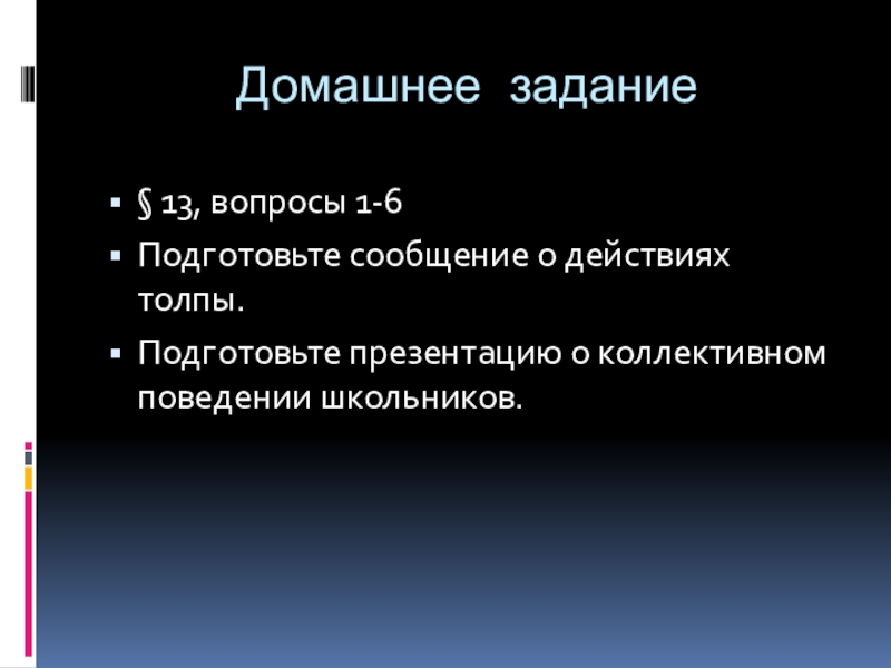 Домашнее задание§ 13, вопросы 1-6Подготовьте сообщение о действиях толпы.Подготовьте презентацию о коллективном поведении школьников.