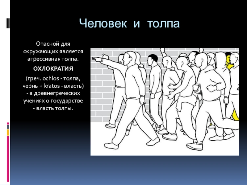 Человек и толпаОпасной для окружающих является агрессивная толпа.ОХЛОКРАТИЯ(греч. ochlos - толпа, чернь + kratos - власть) -