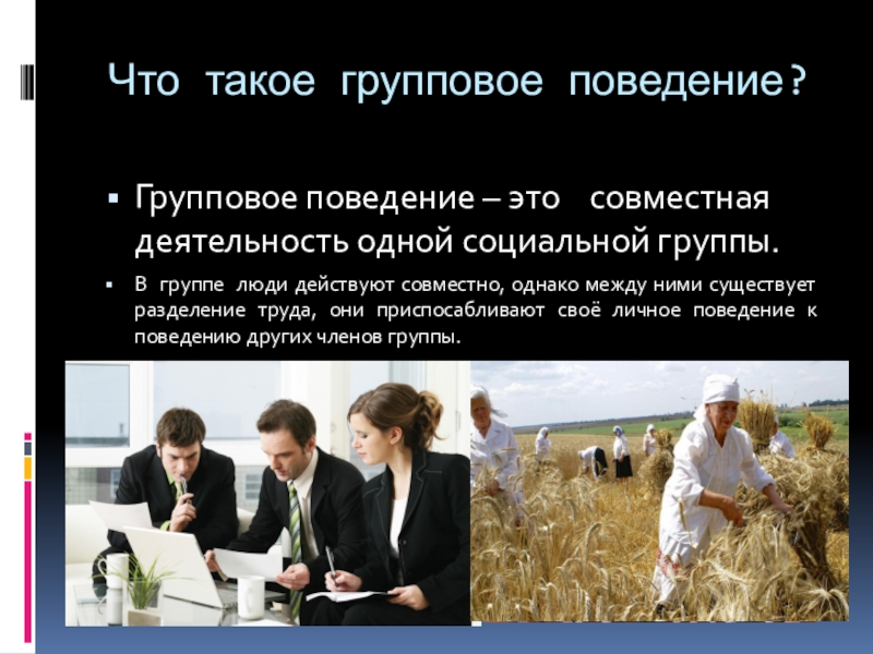 Что такое групповое поведение?Групповое поведение – это  совместная деятельность одной социальной группы.В группе люди действуют совместно,