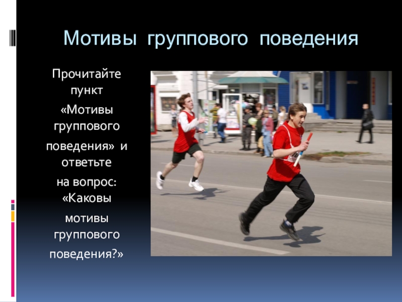 Мотивы группового поведенияПрочитайте пункт «Мотивы группового поведения» и ответьте на вопрос: «Каковы мотивы групповогоповедения?»