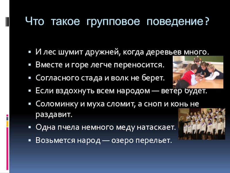 Что такое групповое поведение?И лес шумит дружней, когда деревьев много.Вместе и горе легче переносится.Согласного стада и волк