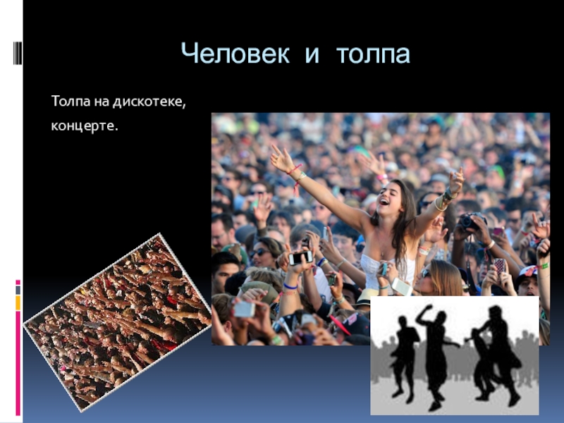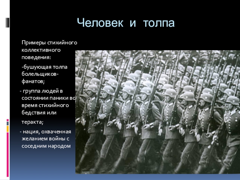 Человек и толпаПримеры стихийного коллективного поведения:-бушующая толпа болельщиков-фанатов; группа людей в состоянии паники во время стихийного бедствия