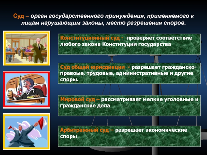 Суд общей юрисдикции - разрешает гражданско-правоые, трудовые, административные и другие споры.