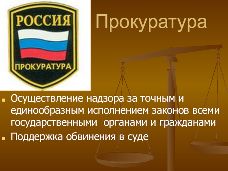 Прокуратура Осуществление надзора за точным и единообразным исполнением законов всеми государственными органами и гражданамиПоддержка обвинения в суде