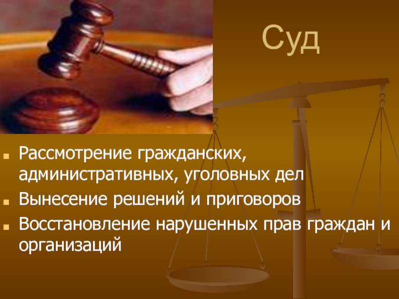 Суд Рассмотрение гражданских, административных, уголовных делВынесение решений и приговоровВосстановление нарушенных прав граждан и организаций