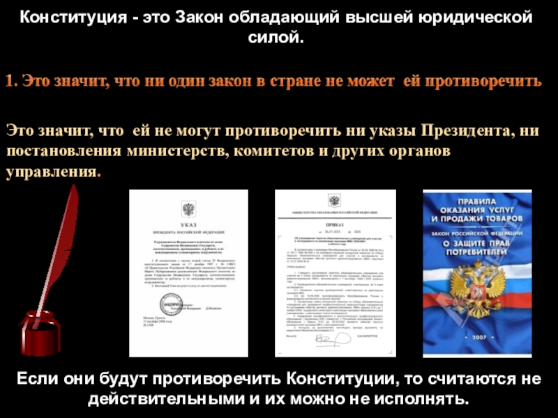 Конституция - это Закон обладающий высшей юридической силой.Это значит, что ей не могут противоречить ни указы Президента,