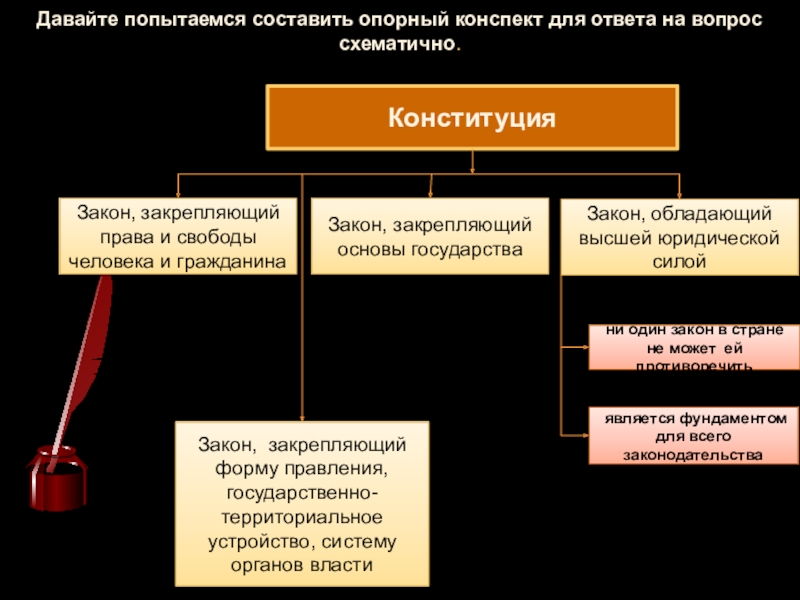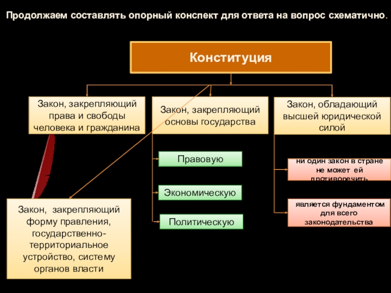 Продолжаем составлять опорный конспект для ответа на вопрос схематично.КонституцияЗакон, обладающий высшей юридической силойЗакон, закрепляющий основы государстваЗакон, закрепляющий