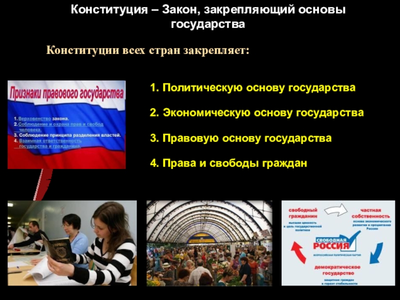Конституция – Закон, закрепляющий основы государства Конституции всех стран закрепляет:1. Политическую основу государства2. Экономическую основу государства3. Правовую