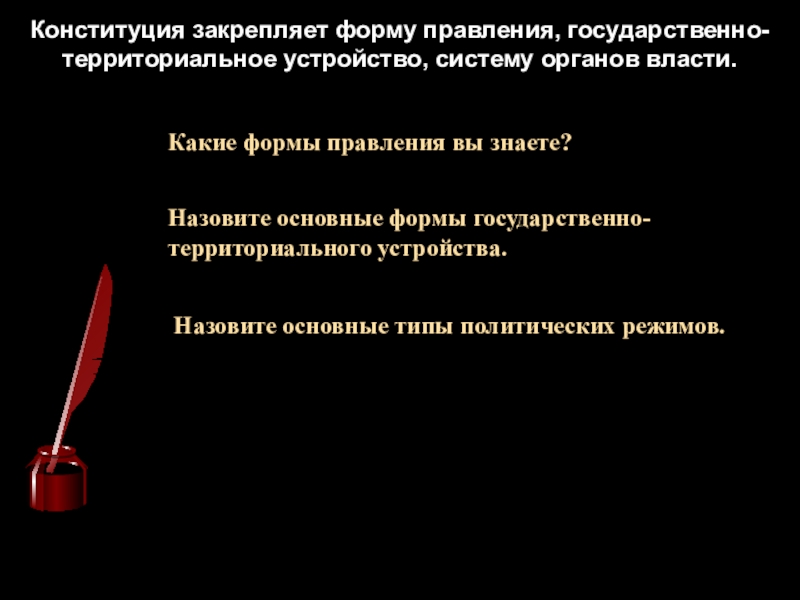 Конституция закрепляет форму правления, государственно-территориальное устройство, систему органов власти. Какие формы правления вы знаете?Назовите основные формы государственно-территориального