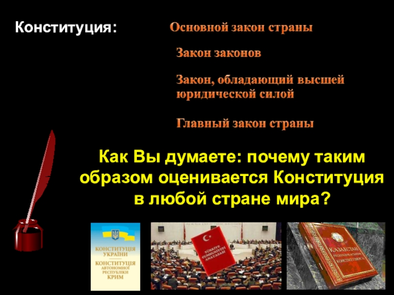 Конституция:Как Вы думаете: почему таким образом оценивается Конституция в любой стране мира?