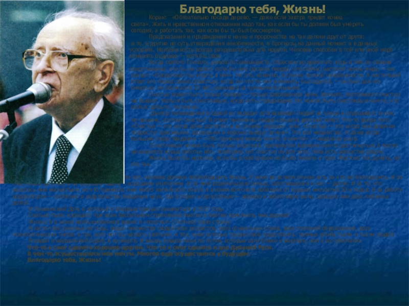 Я думаю, что, достигнув восьмидесяти лет, человек должен поблагодарить Жизнь. У меня во всяком случае есть за что ее благодарить, И за