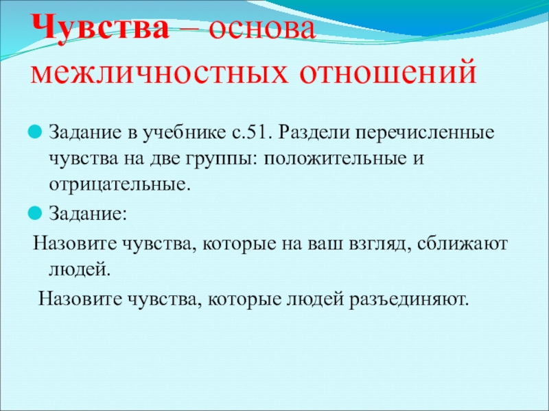 Чувства – основа межличностных отношений Задание в учебнике с.51. Раздели перечисленные чувства на две