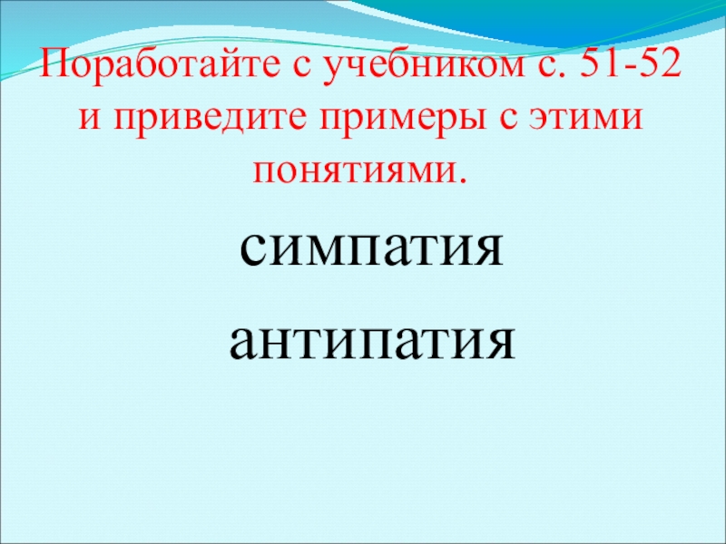 Поработайте с учебником с. 51-52 и приведите примеры с этими  понятиями.симпатия антипатия