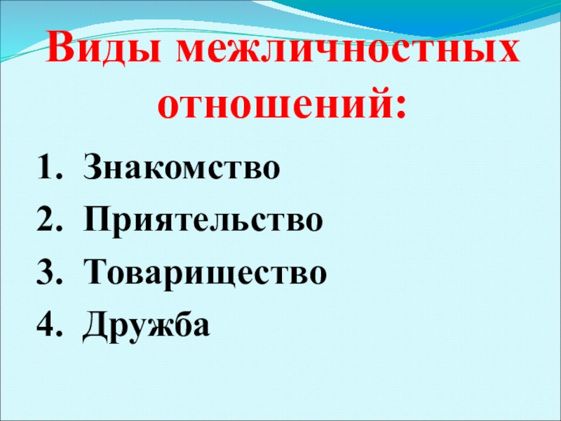 Виды межличностных отношений: 1. Знакомство2. Приятельство3. Товарищество4. Дружба